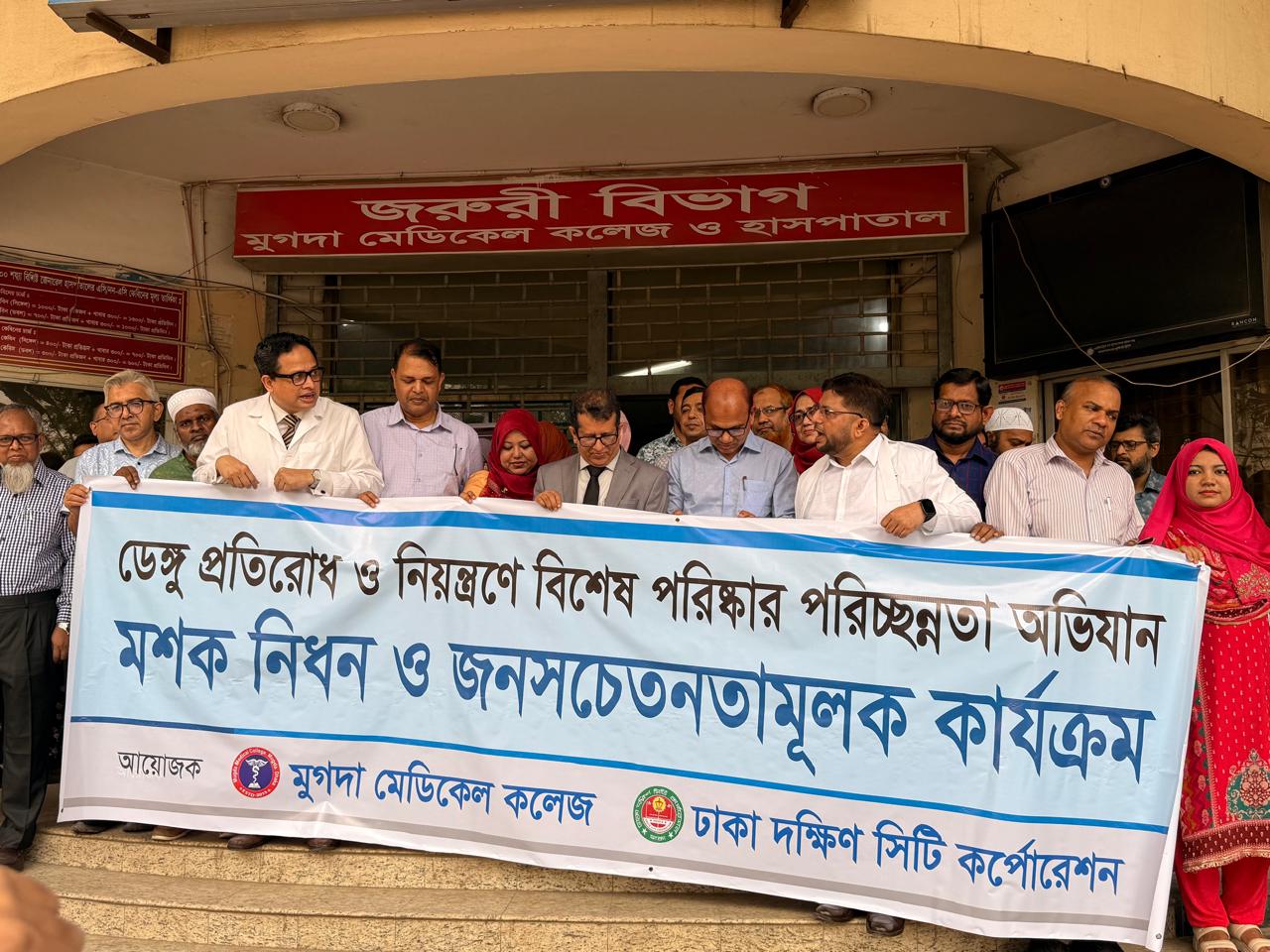 ডেঙ্গু প্রতিরোধ ও নিয়ন্ত্রণে বিশেষ পরিষ্কার পরিচ্ছন্নতা অভিযান, মশক নিধন ও জনসচেতনতামূলক কার্যক্রম আয়োজক • মুগদা মেডিকেল কলেজ এবং ঢাকা দক্ষিণ সিটি কর্পোরেশন।